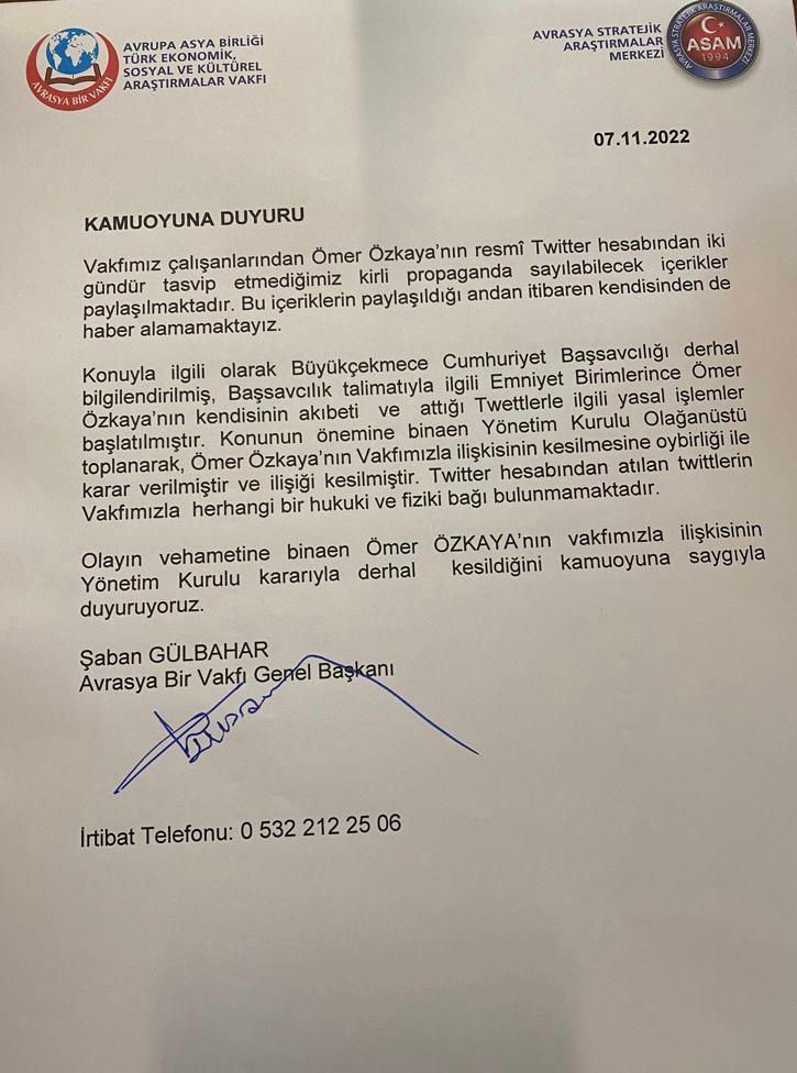 Konuyla ilgili olarak Büyükçekmece Cumhuriyet Başsavcılığı derhal bilgilendirilmiş, Başsavcılık talimatıyla ilgili Emniyet Birimlerince Ömer Özkaya’nın kendisinin akıbeti ve attığı Twettlerle ilgili yasal işlemler başlatılmıştır. Konunun önemine binaen Yönetim Kurulu Olağanüstü toplanarak, Ömer Özkaya’nın Vakfımızla ilişkisinin kesilmesine oybirliği ile karar verilmiştir ve ilişiği kesilmiştir. Twitter hesabından atılan twittlerin Vakfımızla herhangi bir hukuki ve fiziki bağı bulunmamaktadır.